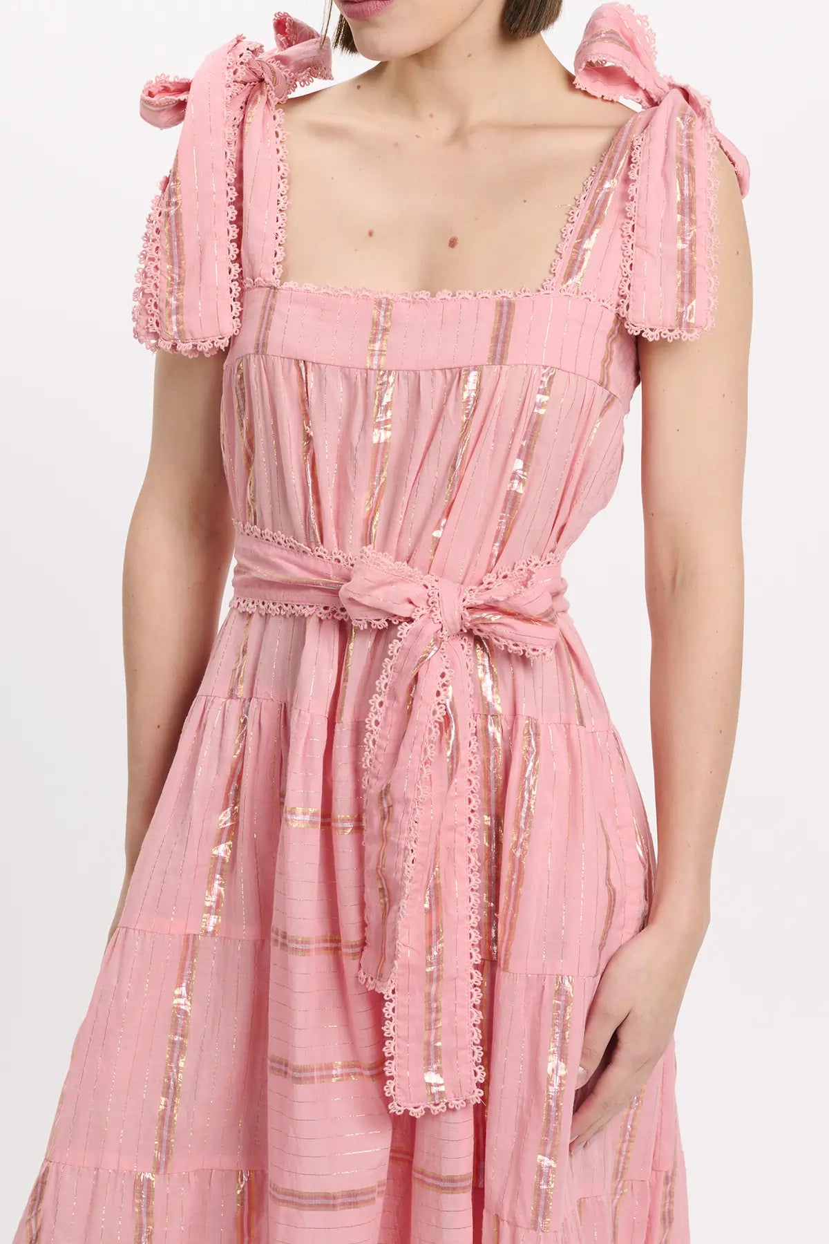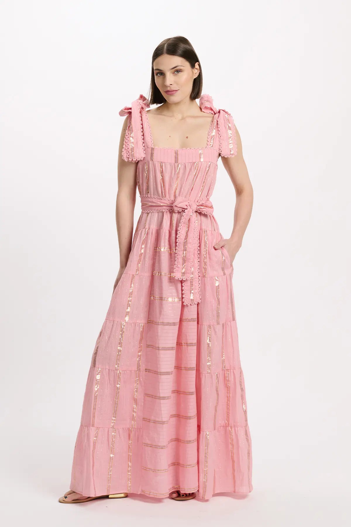 The chic Aly Dress from Miss June is so glamorous with its long tiered skirt and metallic thread glistening as it captures the light.
