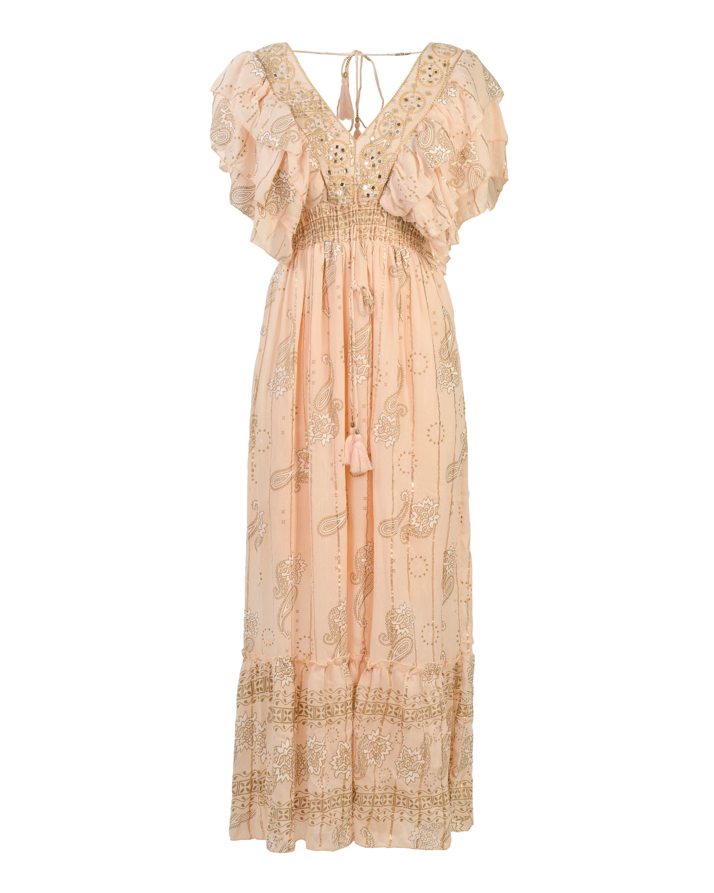This flowy light peachy pink boheamian dress with its intricate gold paisley patterns and shimmering foil print has a deep V neckline with delicate tassel ties and a matching V back with tie.