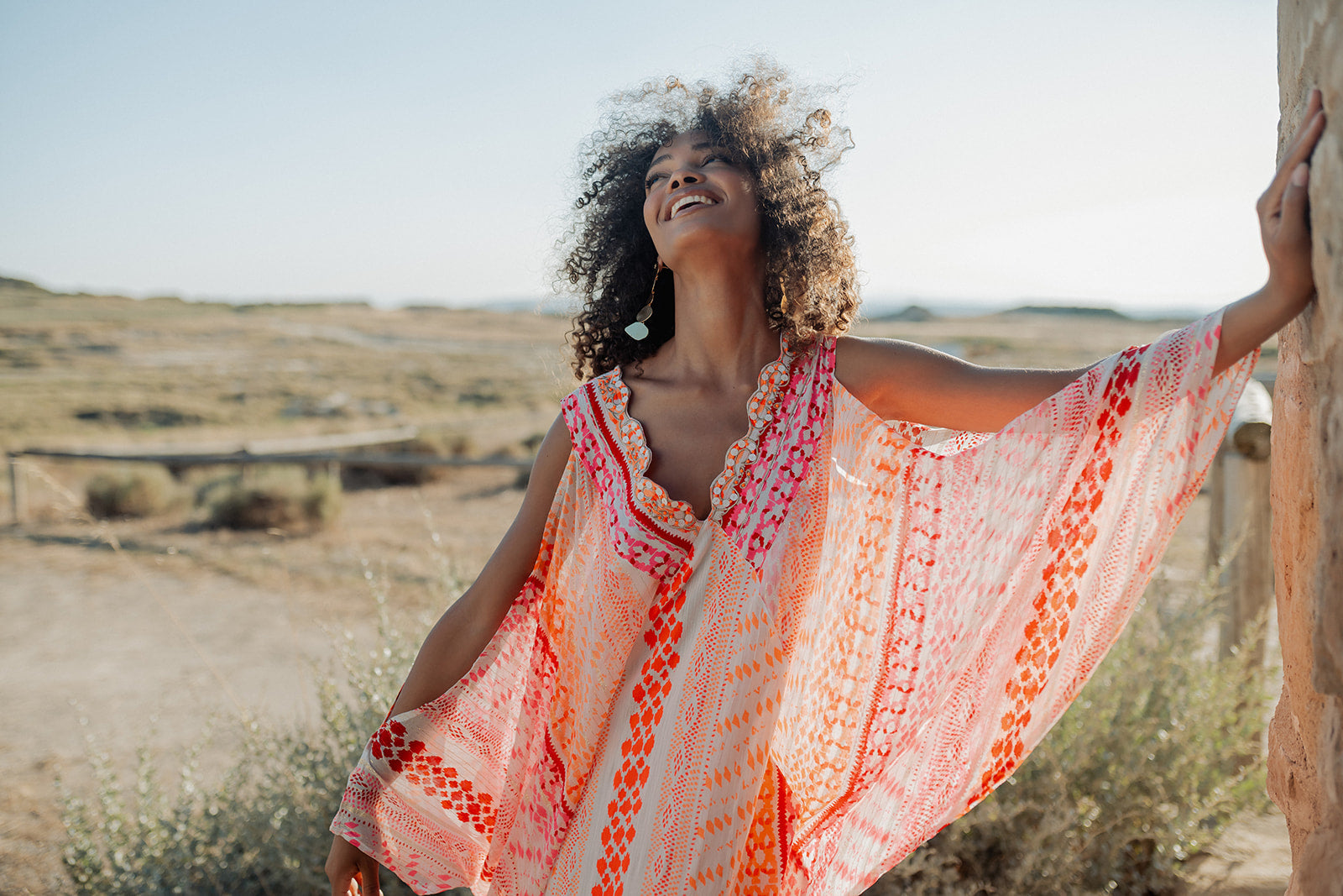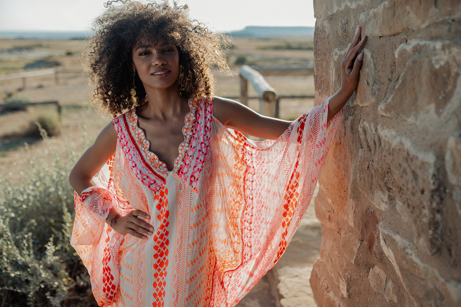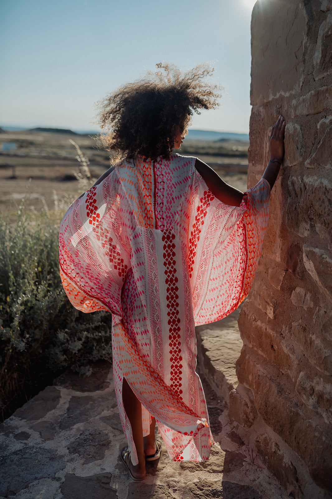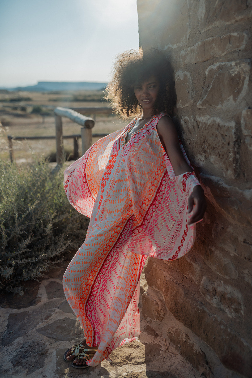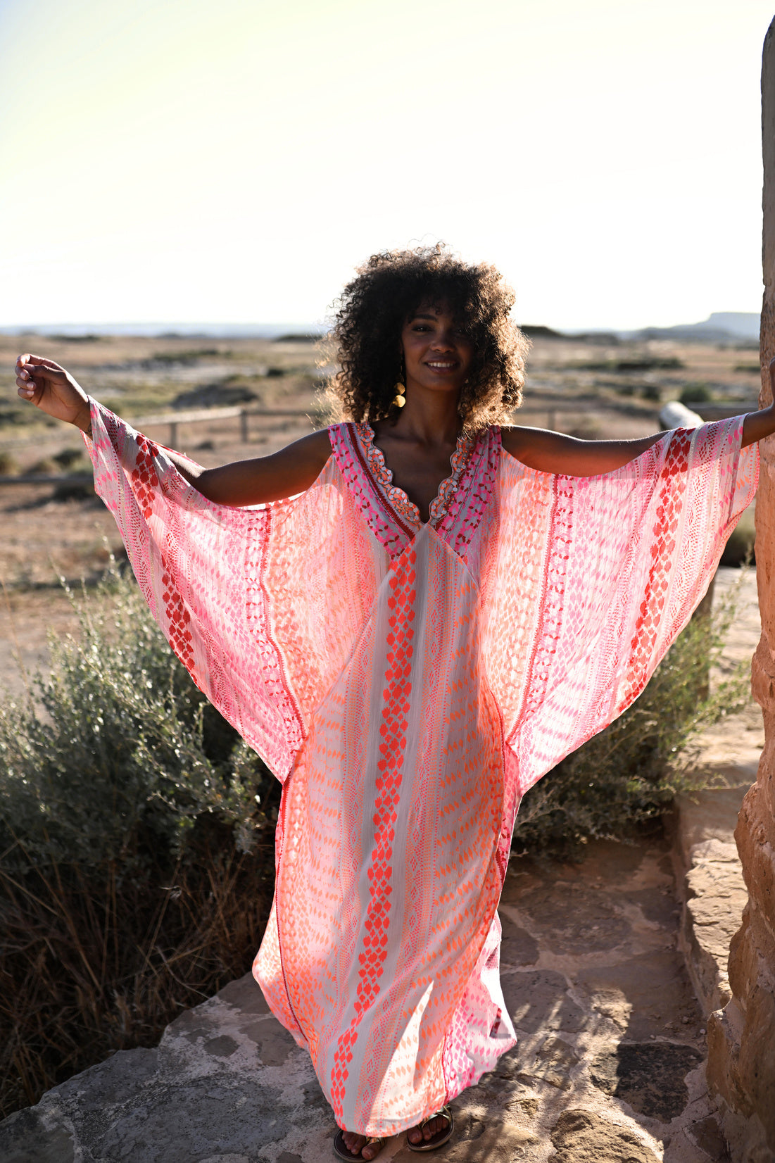 This beautiful free flowing kaftan is a perfect addition to your holiday wardrobe.