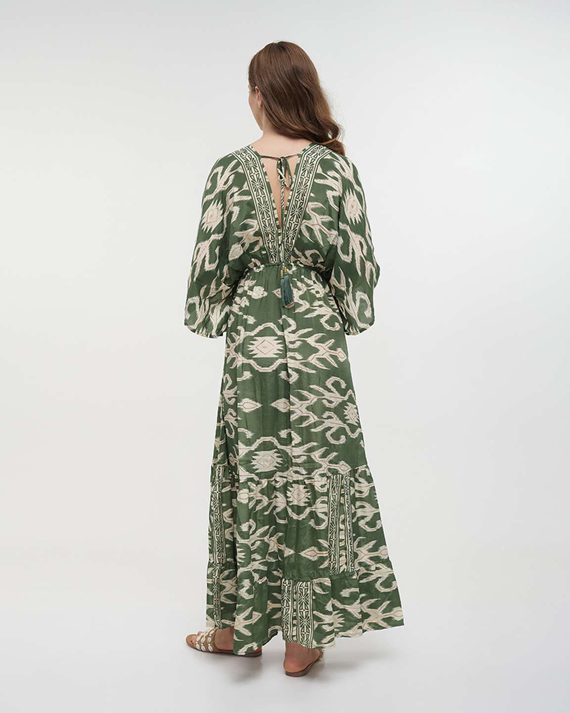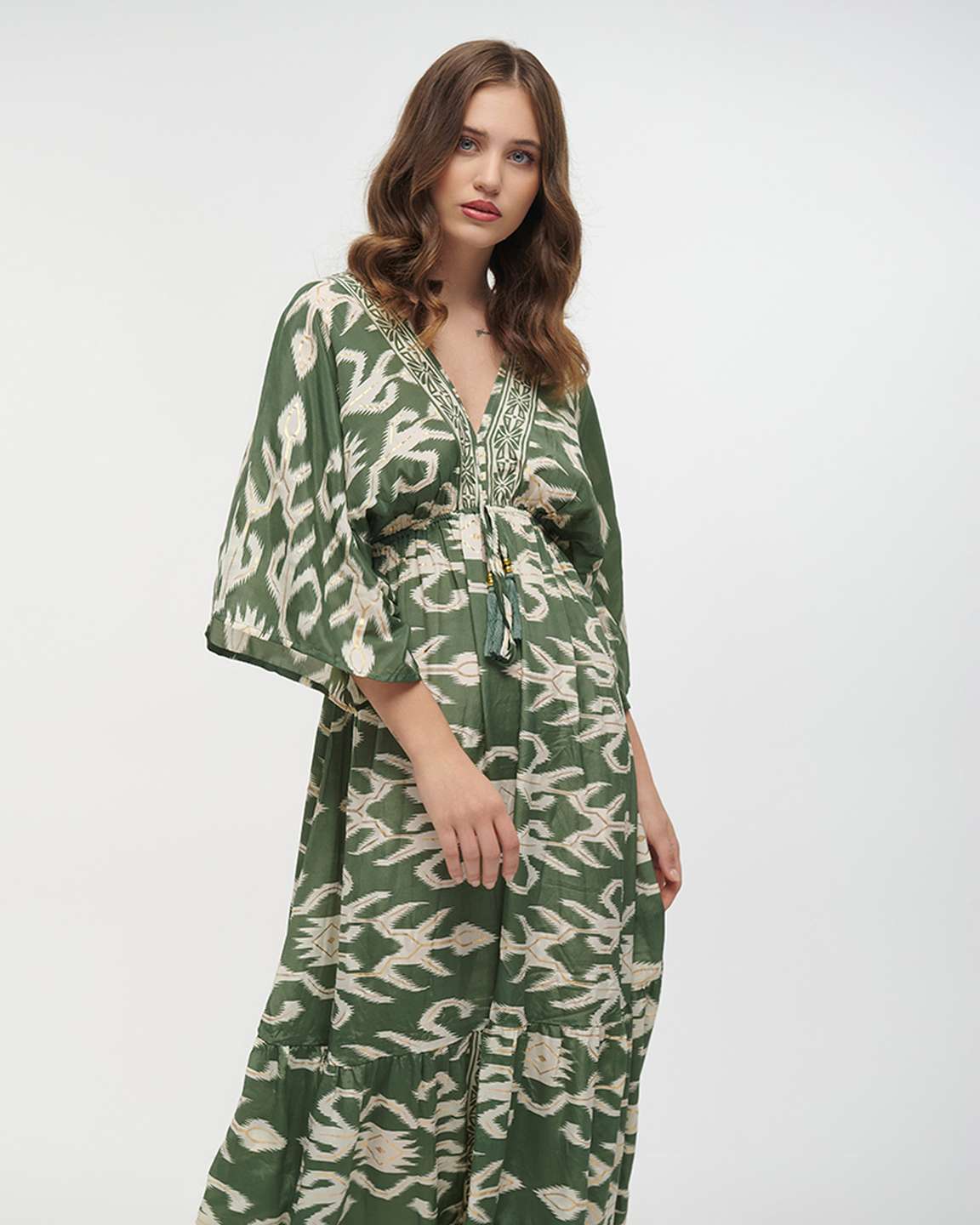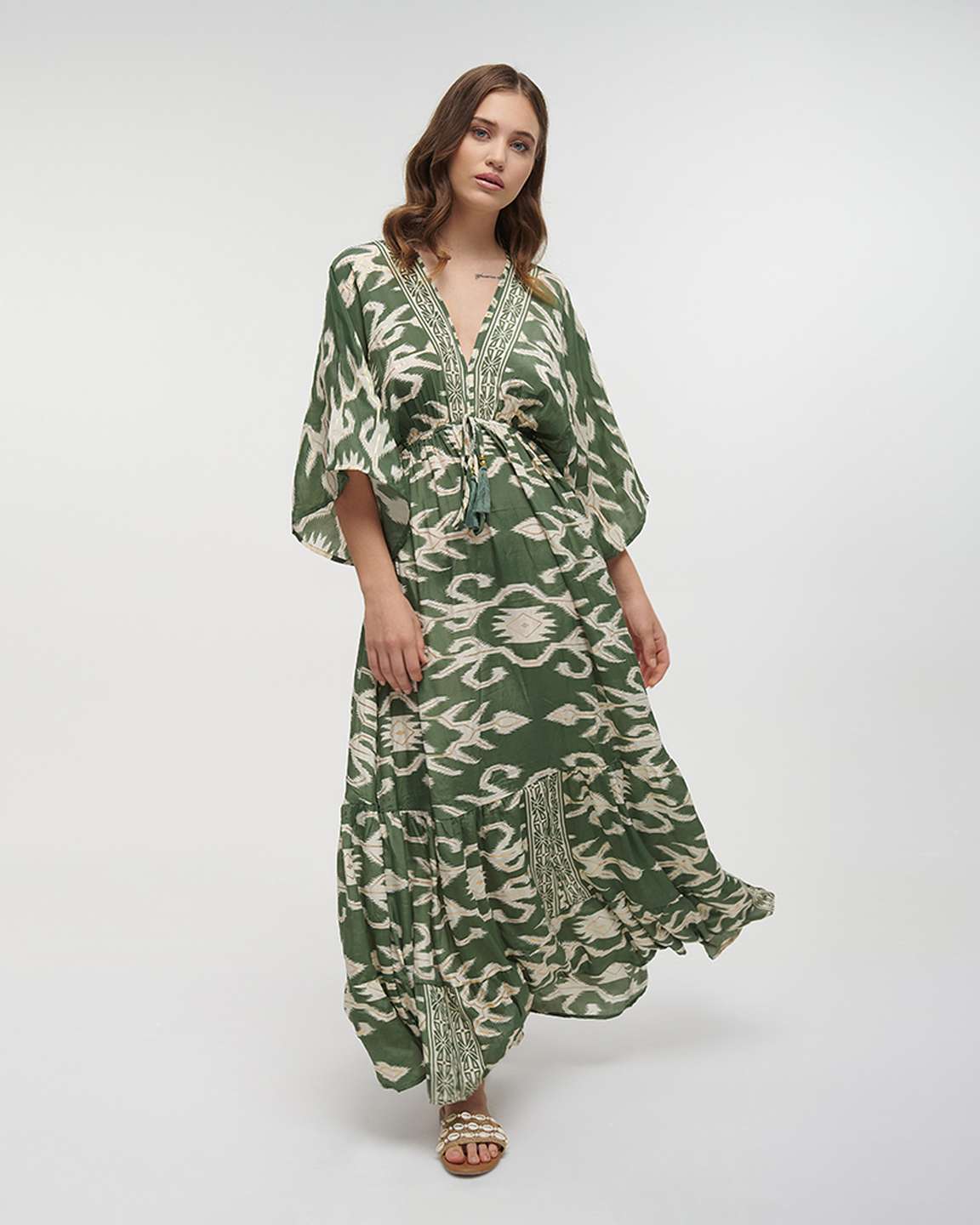 A free flowing long silky kaftan style dress that draws in under the bust with a tassel trim, v neckline and wide sleeves. It has a tie back and a tiered long skirt. The fabric has gold details running through it.