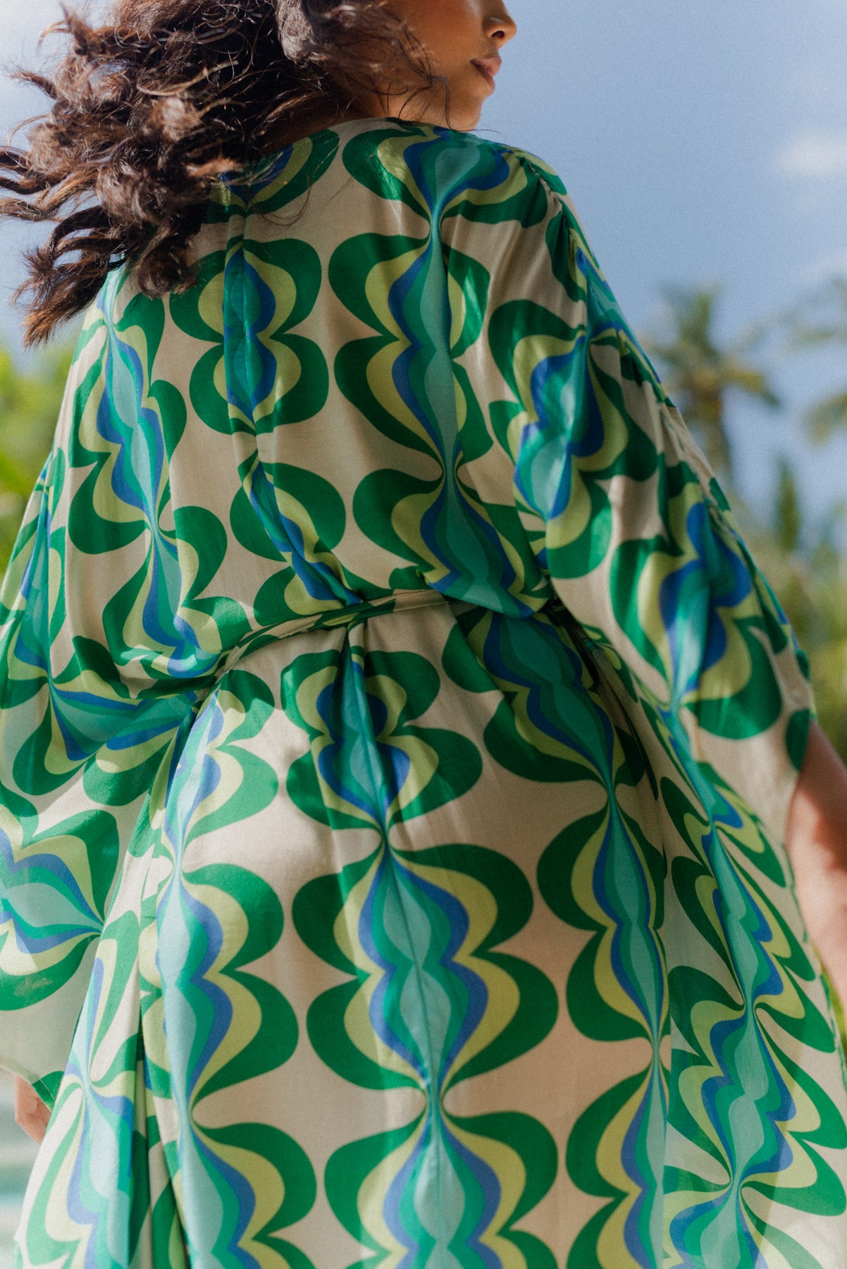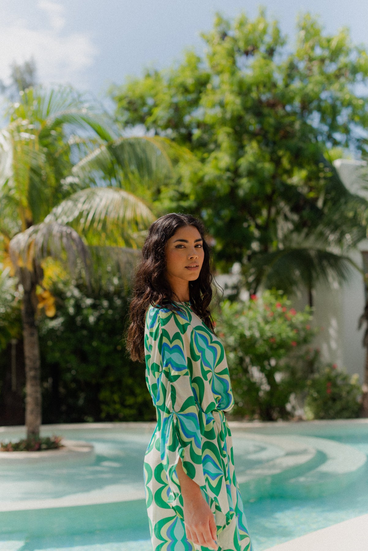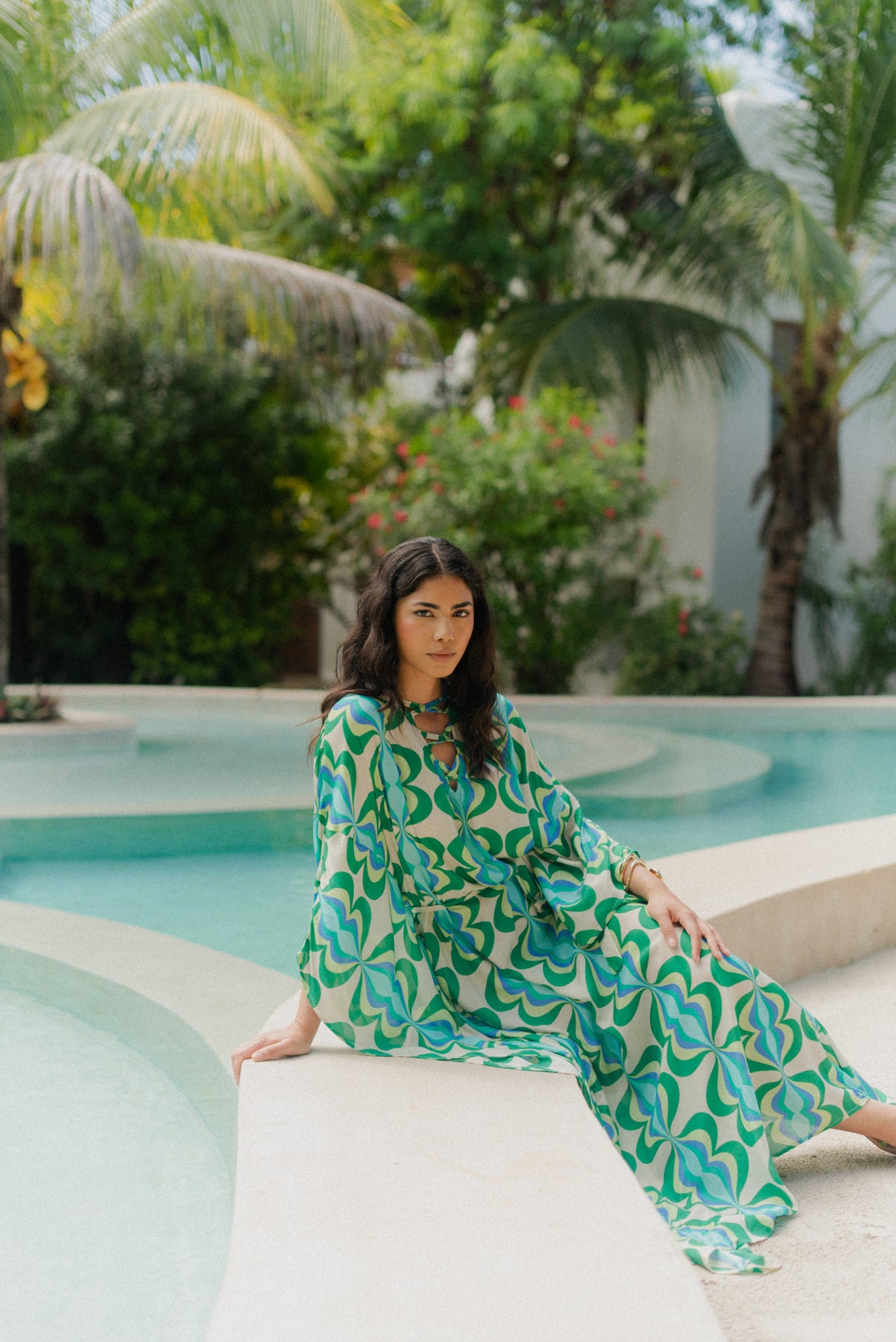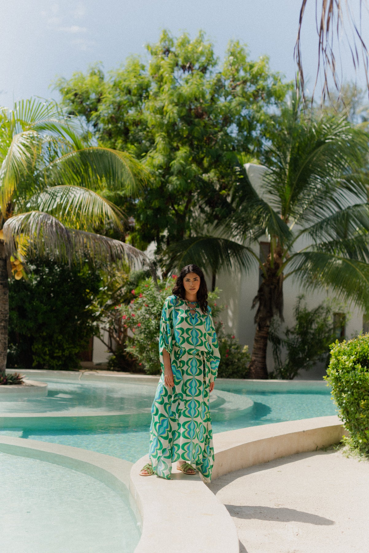 Made in Sundress's new signature print in a green and blue palette, Lavande is a long and oversize kaftan which can be worn to make a statement on the beach.